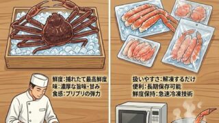 活カニと冷凍カニの鮮度・味・食感の違いを徹底比較。急速冷凍の仕組みやドリップの発 生など鮮度差の理由を解説し、用途別の選び方や通販で失敗しないポイントを分かりやすくお伝えします。